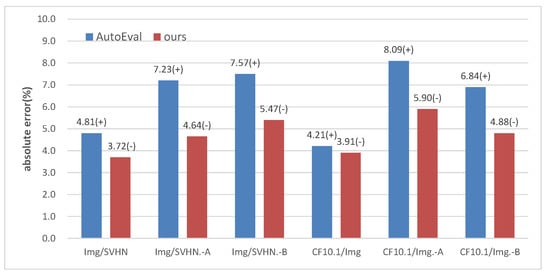 The graph shows the comparison of the error rate between our proposed method and AutoEval on transformed test sets. Img represents the ImageNet dataset, and CF10.1 represents the CIFAR10.1 dataset. For group A images, we applied cutout, while for group B, we used shear and changed the hue. (−)/(+) indicates that the predicted accuracy is lower/higher than the ground-truth accuracy. As shown in the figure, our method always outperforms traditional AutoEval on transformed datasets.