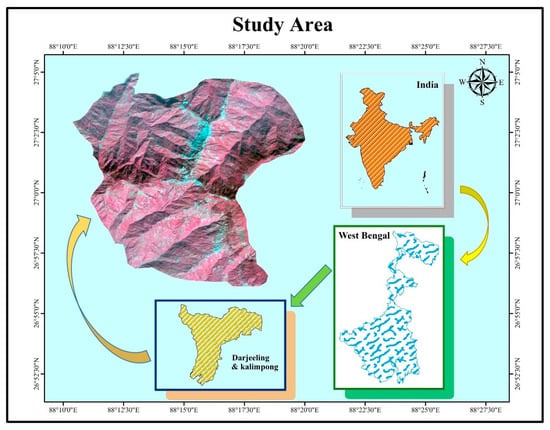 The study region is located in the Darjeeling district of West Bengal, India, in the Eastern Himalayan mountain environment (Figure 1). The area is situated in latitudes 88°171′ E to 88°343′ E, 26°933′ N to 27°082′ N and encompasses around 256 Km2 of the region. The maximum elevation in this region is 2600 m from mean sea level (MSL). The most dreaded and widespread landslide event in the Darjeeling Himalayas occurred in 1968, triggering many shallow and deep-seated landslides [40]. It is believed that many prominent and large landslides in the Darjeeling hills are still active today [41]. Thus, the region requires a systematic study for LSM. The landslide’s study area induces inherent factors such as highly dissected slopes, barren land, etc. Tea plantation is the primary land use operation in this area. The study region had a population density of 586 per sq·Km, while the Darjeeling district’s population was 1,846,823 as per the 2011 census.