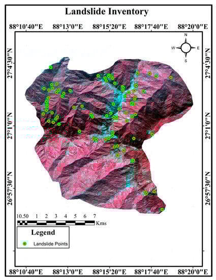 The position and extent of the landslide must be appropriately identified when creating the maps of landslide susceptibility. Landslide inventory is a critical component of all types of landslide zoning classification, including hazard, susceptibility, and risk zoning [42]. It has to deal with the time, location, sort, amount, and travel distance of land sliding in a specific area. Different methods are available for identifying landslides. Field observations, satellite photographs, book studies for details on previous landslides, and aerial photography are a few of them [43]. The landslide inventory map was produced using a combination of visual analysis of aerial imagery, field data, and satellite photography [14]. The whole data on landslides in India were made available by the Geological Survey of India (GSI). Resampled public data from the GSI were used to create the inventory map for the study area. One hundred and fourteen landslides have been found by this study using the available data (Figure 3). Most of the landslides recorded in this area have cliffs, highways, and banks of rivers. Erosion, steep terrain, and a lack of flora are often the causes of landslides along cliffsides.