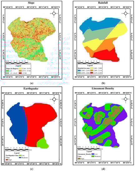 Thematic layers significant to the causative factors presented in Table 1 were prepared using various remotely sensed data from multiple sources. The GIS software (ArcGIS 10.4) was used for preparing layers such as slope, aspect, drainage density, and lineament density from ALOS PALSAR DEM. The soil and geomorphology maps of West Bengal were collected from the National Bureau of Soil Survey and Land Use Planning (NBSS and LUP), Government of India. A geology map was compiled from the Geological Survey of India (GSI). The Catrosat-2 series (MX) dataset generated a land use and land cover (LULC) map. The drainage density and lineament density maps were made from the ALOS PALSAR DEM data. Data on rainfall were gathered from the Current Research Unit (CRU). The inverse distance weighting (IDW) method for interpolation was used to prepare a rainfall map. An earthquake map was prepared from the data procured from the National Centre for Seismology, New Delhi, India.