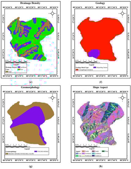 Geomorphology plays a significant role in the command of landslides. Inflated altitude regions are more vulnerable to landslides than lower altitude regions. The geomorphology map (Figure 4g) was extracted from the published map from the BHUKOSH portal (https://www.bhukosh.gsi.gov.in (accessed on 31 May 2022)) in the GIS environment.