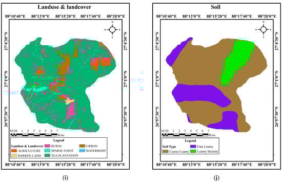 A key element contributing to the incidence of landslides is land use and land cover. Barren regions are more prone to landslides than lush trees. Deforestation is another essential factor that causes landslides. Areas covered with vegetation have seen that the big woody trees with long root systems have helped to improve slope stability in the area. Vegetation density is inversely proportional to landslides [55]. The LULC map (Figure 4i) was extracted using CARTOSAT-2 (MX) series imagery. The LULC map is organized into many categories, including rural and urban areas, sparse forests, tea plantations, agricultural land, barren land, and waterbodies. The southern portion of the area is where you will find agricultural land and developed regions with excellent road access. The bulk of the basin is covered in forest. In the southern zone, human intervention is more common than in the northern region, owing to accessibility issues.