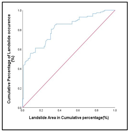 To evaluate the accuracy of a predictive model, it is important to compare the model’s predictions to real-world data. In the case of a landslide susceptibility map developed using the analytic hierarchy process (AHP) model, one method of validation is to use a success rate curve. The success rate curve is constructed by plotting the cumulative percentage of observed landslide occurrence against the cumulative percentage of the study area in decreasing the landslide susceptibility index (LSI) values [21,73]. The area under the success rate curve can be used to assess the accuracy of the prediction [53]. To validate the AHP model’s landslide susceptibility map, 30% of the data were randomly selected and used for model validation. The results of the success rate curve analysis for the AHP model showed an area under the curve of 0.813, corresponding to a prediction accuracy of 81.30% (Figure 7). The results show good accuracy of the model.