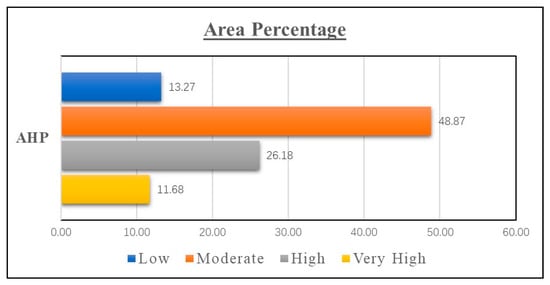 From the outcome of the AHP model, the results were utilized to generate the final LSM and classified into low susceptibility, moderate susceptibility, high susceptibility, and very high susceptibility zones (Figure 5). Susceptibility mapping for the study area shows that the very high susceptibility zone covers 14.40% (19.312 km2), the high susceptibility zone covers 32.20% (43.180 km2), and the moderate susceptibility zone covers 36.77% (49.321 km2). The low susceptibility zone covers 16.63% (22.303 km2) of the total area. So, we observed that 83.37% of the total area comes under the moderate to very high zone.