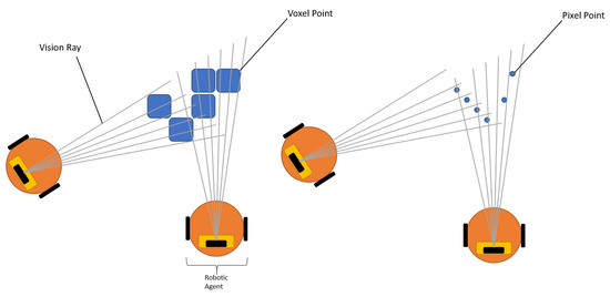 One might look at this approach and ponder on the differences between the SLAM system, or, indeed, other mapping systems that align 3D point clouds of data. The response is that with the voxel grid system, the world state does not move with new alignments; that is to say that when an agent revisits an area and the coordinate is perceived as different, the map the agent has generated is not moved or aligned, but, rather, the information is fed into the voxel at the new coordinate. An example of this is shown in Figure 2.