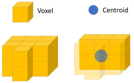 Now that the origin is defined, the voxel generation process should be considered and the information contained within. First, the most basic information—positioning—can be inspected. After the alignment of one frame to another, the agent can simply take the point in 3D space and update the world space. However, this method would be too fine in resolution and we would rather combine information from close neighbours to generate a more generalised view of the information. For this, a region of interest can be simply defined and information can be captured from any point inside that ROI. This is not dissimilar to downsizing, but, rather than an average of the points’ locations, it is the mode of where more points fall in the world space voxel grid.