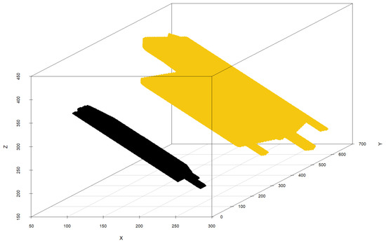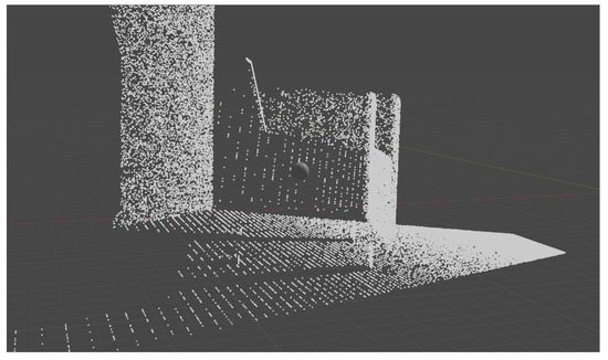 Object detection from a recognised set—A key aspect identified in the hypothesis is that of object recognition under occlusion. That is, it is difficult to identify objects that are partially obscured, by either other items within the environment or perhaps poor viewing angles. The voxel grid can address these issues by allowing the object being identified to be reconciled with a template for the given object to be found, over multiple orientations and scales. The voxel grid also provides wider net data points, as, rather than captured visual data being points x,y,z in a space with no determined size, they fall into a discrete grid of voxels with a defined size. This in turn means that when an agent is scanning for an object it has an increased probability of catching a feature, an example of this is shown in Figure 6 with the real data comparison shown in Figure 7. It should be noted, however, that this comes at the cost of the resolution of the visual data.