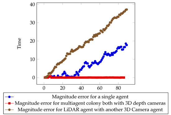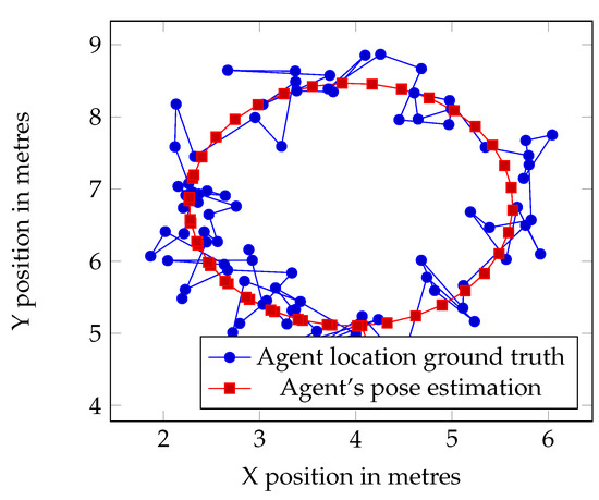 The following results are categorised into three sets, each measuring the pose estimation of a single agent. An initial image is provided below to establish the ground truth of the measured agent and to provide a measurable baseline. All agents employ the approach outlined in this paper. The first set of results shows a single agent using a 3D depth camera. The second set presents the results of a single agent using LiDAR. Finally, the third set of results showcases the same LiDAR agent, but this time utilising the 3D data from the other agent.