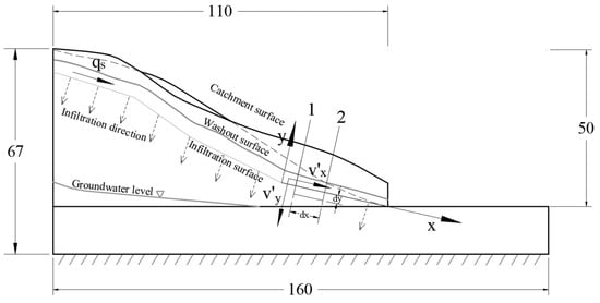 In this equation, is the scouring coefficient, which is related to the water depth of the slope’s surface, the inclination angle of the slope body, and the friction angle of the soil body. and are the flow shear stresses of Section 1 and Section 2, respectively. Equation (15) is simplified to: