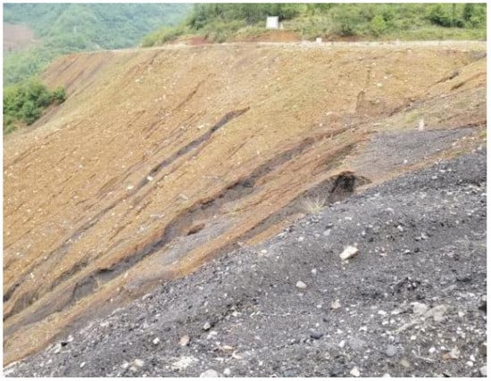Gangue is the solid waste discharged during coal mining and washing. It refers to a black-gray rock with a low carbon content and a higher level of textural hardness than the coal associated with the coal seam during the coal-forming process [1]. There are now about 7 billion tons of gangue in China, and this value continues to increase year by year [2,3]. Gangue dumps discharged from mines are essentially formed by piling on the ground. There are more than 1600 gangue dumps formed by the long-term accumulation of gangue, and Guizhou accounts for about 65% of the country’s total output. The accumulation of gangue not only takes up a large amount of land resources but it also forms many gangue dump slopes [4,5]. The rainfall-induced instability of refuse hill slopes is one of the most dangerous features of refuse hill accidents, which affect the process of waste disposal and also threaten the lives and safety of on-site workers [6,7].