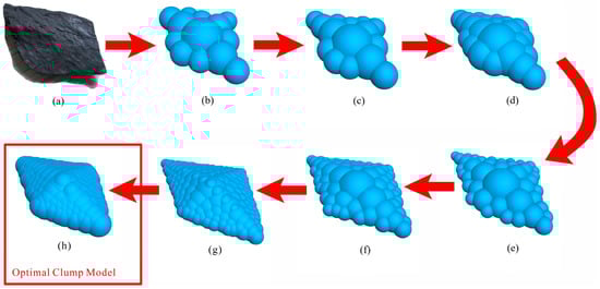 The literature [40] shows that the appearance of gangue blocks is extremely irregular, with certain elongations and flat areas, which leads to an obvious biting action and stress concentration between gangue blocks. In order to simulate this characteristic of gangue as far as possible, and to improve the calculation efficiency, we use the basic unit “Ball” in PFC3D software to simulate particles in bulk materials such as crushed gangue, coarse-grained soil, and non-sticky sand. However, a ball is a rigid body with a rounded surface, which cannot simulate the biting action, stress concentration, and fracture between particles. Therefore, based on the clump command in PFC3D and two real shapes of a gangue block (block and sheet), a three-dimensional numerical model is simulated. First, it is imported into PFC3D using the geometry import command, which provides an enclosed restriction space for the generation of a gangue block in PFC3D. Then, the Pebble unit is used to fill the target restricted-space area. During the filling process, the Pebble continuously adjusts its radius and position in the filling area, according to the BubblePack algorithm, until the error between the filled volume of Pebbles and the target restricted-space volume is less than the set threshold, stopping filling and completing the generation of the clump aggregate. The final generated clump templates of the two shape categories of waste rock blocks and their shapes’ characteristic parameters are shown in Figure 4 and Figure 5. “Ratio” and “distance” are the two key words used in the BubblePack algorithm to control the effect of clump generation. “Ratio” controls the ratio of the Pebble’s minimum radius to the maximum radius used to generate the clump template, ranging from 0 to 1.0; “distance” controls the smoothness of the clump template generation, ranging from 0 to 180. The larger the value, the smoother the surface of the clump generated. When the value is 0, only point contact, with no overlap, is allowed between the PBBs used to generate the clump. When the value is 160, the PBBs used to generate the clump are allowed to overlap completely. From Figure 4 and Figure 5, it can be seen that when ratio = 0.5 and distance = 160, the clump template generated by the BubblePack algorithm not only restores the original appearance of the gangue block, but it also takes into account the basic external shape and calculation efficiency of the gangue block; therefore, this method was adopted.