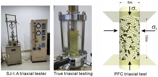 For the simulation study of particle flow, the key condition to determine the rationality of the model is the selection of the model’s meso-parameters. The micro-parameters of a material cannot be directly assigned by real macro-mechanical parameters, so they need to be adjusted using an equivalent comparative test to ensure that the material’s behavior is close to the real effect. In this study, a large number of repeated triaxial tests were carried out by continuously changing the micro-parameter settings. At the same time, the numerical model of gangue specimens was established based on the servo principle of the PFC3D triaxial test; additionally, the stress–strain comparison analysis and micro-parameter calibration of the gangue were carried out. Finally, the appropriate micro-parameters were determined, as can be seen on the right of Figure 6. The model generates particles in the cylinder wall with a diameter of 5 m and a height of 10 m according to real triaxial testing. Considering the influence of the particle size effect on the test results [41], for a ratio of model size to average particle size >30, the appropriate change in the particle size does not affect the simulation results but it will improve the calculation efficiency. The particle size distribution of the PFC is shown in Table 1. The model established in this paper was repeatedly checked and adjusted. The average particle size is 1.9 m, the ratio of the minimum slope model size (66 m) to 1.9 m is 37, and the ratio of the maximum model size (160 m) to 1.8 m is 89. These ratios are much larger than the standard value of 30, so the particle size values in this model are reasonable. The three-axle confining pressure was loaded according to the values of 100 KPa, 200 KPa, and 300 KPa from the laboratory test.