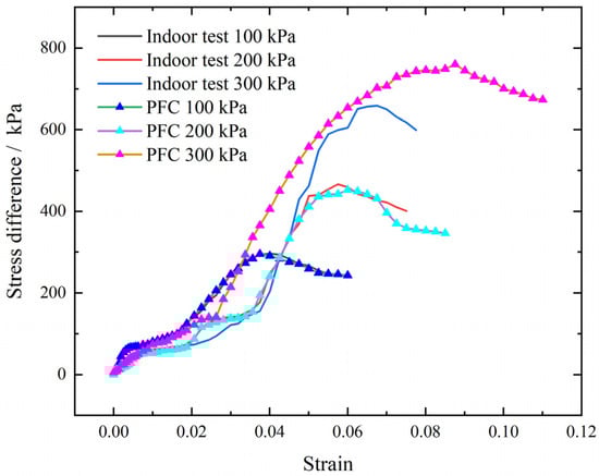 The trend in the stress–strain curves is the key to determining the relationship between the meso-parameters and macro-parameters; this is also the micro-parameter calibration method adopted by most scholars. On this basis, the stress–strain curves were obtained, as shown in Figure 7. Compared with the indoor triaxial test, the trends of the two stress–strain curves obtained from the numerical triaxial test under the same ambient pressure are essentially the same as those of the indoor test, and the peak deviation stress error of the gangue is largely maintained within the range 0~1 KPa.