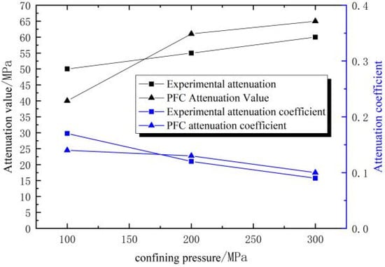 According to Formulas (27) and (28), the attenuation value and attenuation coefficient of the gangue were calculated as shown in Figure 8. It can be seen that with the increase in the confining pressure, the attenuation value of gangue strength will gradually increase, but the attenuation coefficient will decrease with the increase in the confining pressure, so the brittleness will gradually decrease. It is determined that the confining pressure of 100 KPa~300 KPa characterizes a process of gradually weakening ductility development for the gangue. Although brittleness gradually decreases, from the trend of the increasing intensity attenuation value, the brittleness of the gangue increases. This is because the internal particle structure distribution of the gangue is looser than that of general rocks, and there are differently sized gangue particles. Small gangue particles are tightened first, which weakens the brittleness. The brittleness is enhanced by contact within a large-sized gangue. Between 100 KPa and 300 KPa, the inner part of the gangue is characterized by the contact shrinkage process of a small-sized gangue, so its brittleness is gradually smaller. The error of the attenuation value is controlled within 10 KPa, and the error of the attenuation coefficient is controlled within 0.025; both parameters are within a reasonable error range.