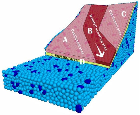 This phase corresponds to the 10–20 min period shown in Figure 11. The early stage of rainfall occurs from 0 to 10 min and no obvious slope erosion occurs. Clump particles do not disengage from the slope. However, a displacement shape similar to that of gully 5 is formed in area B of the slope’s surface. At this time, the scouring condition of the slope’s surface is still in the early stage of catchment. The effect of hydraulic force on the clump particles is mainly concentrated in the valley. An arc-shaped radial flow channel is formed in the whole area (B), with the displacement of clump particles at 0–0.4 m and the maximum displacement concentrated at the bottom of the slope. As the hydraulic downward action destroys the particle contact model, the interaction between the particles at the bottom of the slope increases and the displacement increases. At 20 min, the clump particles on the surface of the slope begin to be destroyed and they disperse and disengage from the slope. The particles are taken away from the suspension module, and the maximum displacement is 9.79 m. This process is called sheet erosion, where rills appear on the bottom surface of the slope. At the same time, the catchment on the slope’s surface gradually transfers from Zone C to Zone A, and the particle displacement can reach 1.5 m due to catchment erosion.