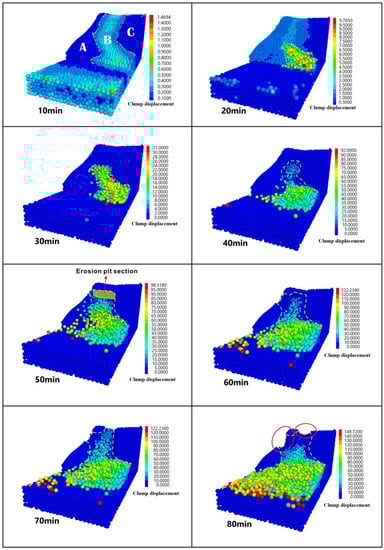 According to the phenomenon whereby two scouring diversions occurred in the previous stage, the effect of hydraulic pressure on particles reaches its peak at 70 min, and the scouring intensity is the most intense at this point. When the top erosion pit section is gradually destroyed and collapses, the energy at the top of the slope is gradually released, the particles begin to accelerate the erosion, and a large number of particles are washed to the bottom of the slope and accumulate outward. At this time, the maximum displacement of the accumulated particles is 122.24 m, which is similar to the displacement observed in the previous stage, indicating that the whole model is in a state of gradual convergence at this time. Finally, the model tends to converge at 80 min, and, at this time, the gully of the lateral tributary in Zone A also reaches the maximum depth. The particles on the slope top of Zone B are completely connected through the pipe, forming a complete and continuous multidirectional gully with a peak displacement of 149.72 m.