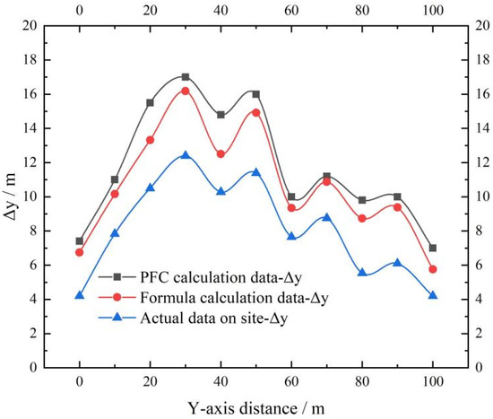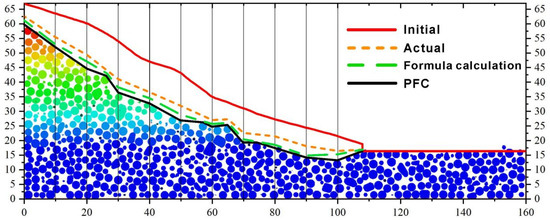 After the PFC simulation calculations, the final gully failure pattern was obtained. The model angle was adjusted and the failure form of the coal gangue slope near Panzhou Electric Field in Guizhou Province was compared and observed, as shown in Figure 12. It can be seen from the figure that the shape of gully no. 5 simulated by the PFC is similar to the on-site failure shape of the slope, and the failure conditions of the main gully and the tributary gully are basically consistent. We achieved the preliminary aim of a PFC simulation. In order to further verify the rationality of the model and the theory, based on the rainfall scouring shear failure theory previously developed by our team, two types of scouring intensity factors were considered in depth, and the scouring depth optimization theory was further developed in combination with the characteristics of the PFC time effect calculations. Through a field survey, the data of one point every 10 m were input into Formula (22) to obtain the failure depth of each point after rainfall scouring and we compared it with the site failure depth and PFC simulation depth, as shown in Figure 13. Figure 14 shows the final failure critical line under three scouring failure conditions. Combining the two figures, we can see that the depth curve trends of the PFC calculation, the optimization theoretical calculations, and the actual data are consistent. The maximum damage point of gully no. 5 is located within the 30~50 m area in the middle of the slope, and the actual damage depth can reach 12 m. However, the peak depth calculated via the PFC and the optimization theory is relatively large and the curves are relatively close to each other. It can be seen from the profile that the scouring has formed a three-stage ladder effect, which is concentrated at the top of the slope, the middle of the slope, and the bottom of the slope (0~25 m, 25~65 m, and 65~110 m). This step effect fully verifies the intermittent characteristics of the erosion failure of the coal gangue slope. Since the diversion and fault phenomena of rainfall scouring are concentrated at the position of 30~60 m in the middle of the slope, the erosion pit here is the deepest. Finally, it can be seen that the depth calculated via the depth optimization scouring theory, the gully depth under the PFC simulation, and the actual failure depth have a good consistency, which proves the rationality of the simulation and the theoretical deduction. At the same time, the combination of these methods provides a valuable reference for early warnings and the hydrodynamic theory of coal gangue slope engineering disasters.