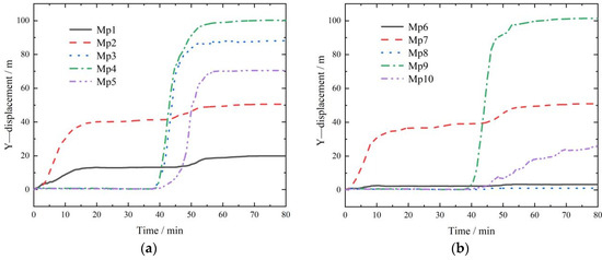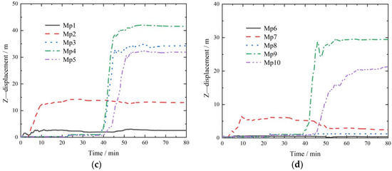According to the analysis of the failure mode, we deduced that the coal gangue slope model is divided into four stages (0–20 min, 20–40 min, 40–60 min, and 60–80 min) in the process of scouring failure. Within the period 0–20 min, the surface particle displacement (MP1, MP2) at the bottom and middle of the slope increases linearly, reaches the maximum value, and tends to be flat at 10 min. The maximum horizontal displacement of the surface particle MP1 at the bottom of the slope during this period is 12 m, and the maximum vertical displacement is 2 m; the horizontal peak displacement of surface particle MP2 in the middle of the slope is 40 m, and the vertical peak displacement is 13 m. During this period, there is no change in displacement at the top of the slope and at the tributaries, which indicates that the first stage of scouring damage impacts the slope bottom first, but the damage trend is obviously more violent in the middle of the slope. When reaching the second stage (20–40 min), there is still no displacement change at the slope bottom, the slope top, or the tributaries. The particle displacement of the surface soil in the middle of the slope increases slowly, but the displacement of its deep particles (Figure 14d) fluctuates, indicating that the erosion damage is concentrated in the middle of the slope at this time. The surface particles are washed with the water flow, and the deep particles are damaged by turbulence. When the scouring reaches the third stage (40–60 min), the surface particle displacement curve between the slope top and the tributary area begins to increase sharply. The maximum horizontal displacement of the slope top can reach 102 m, accounting for 41.76% of the overall horizontal displacement, and the maximum vertical displacement of the slope top can reach 42 m, accounting for 45.85% (see Figure 16). It can be seen from the displacement curve that the displacement at the top of the slope changes prior to the displacement of the tributaries. This shows that after the scouring and accumulation in the middle of the slope, the tributary gap is formed, which is also the reason for the formation of multiple gullies caused by scouring. However, at this time, the stress is not concentrated in the direction of the tributary, but at the top of the slope, so the direction of the gully is not completely changed at this time. It can be seen from Figure 15b–d that the particle displacement curve in the deep part of the tributary changes slowly and is unstable, indicating that the scouring force of the tributary is not strong before the main gully is connected; this again verifies that the stress in the third stage is more highly concentrated at the top of the slope. In the fourth stage (60–80 min), except for the deep particles in the tributary, the particle displacement in other areas tends to be stable, and the particles in the monitoring area have largely been washed to the bottom of the slope with the rain and completed their accumulation. The deep particles in the tributary are still involved in the process of the continuous growth of displacement, which means that after the completion of the main gully’s penetration failure, the energy is completely transferred to the tributary and continues to complete the erosion failure of the tributary. The surface soil is damaged by laminar flow, the displacement of particles is large, and the curve changes in a stepwise manner. The deep soil is greatly affected by turbulence, and the displacement is relatively small, but the displacement curve fluctuates greatly; particles collide with each other and even rebound. During the whole process, the maximum displacement is concentrated at the top of the slope, and its proportions are as follows: top of the slope > tributaries > middle of the slope > bottom of the slope. The peak displacement of the slope top in the horizontal Y-direction accounts for 41.76%, and that in the Z-direction accounts for 45.84% (Figure 16). It is surmised that in the process of preventing and controlling rainfall-induced landslides, priority should be given to protecting the sliding soil mass at the bottom of the slope, and the soil mass in the middle of the slope should be reduced to prevent the maximum energy fluctuation caused by scouring, so as to prevent extensive displacement damage at the top of the slope.