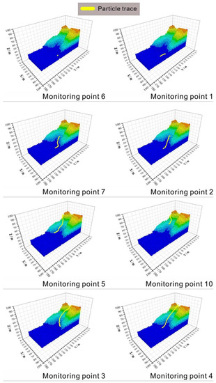 During the numerical calculations, the positions of eight typical monitoring particles were selected, as shown in Figure 17, and the tracked particles were analyzed in combination with the results of the failure mode. At the bottom of the slope, MP1 is preferentially denuded by the thin-layer water flow, and MP6 is greatly affected by turbulence, but this effect is limited to the large particle resistance at the bottom of the slope; the movement tracks of the two are not obvious, and they are characterized by a slow creeping phenomenon, which is defined as a slow accumulation at the bottom of the slope. With the development of the main gully, particles MP2 and MP7 in the middle of the slope move along the main gully to the bottom of the slope under the scouring action, and then accumulate in the Y-direction along with the particles at the bottom of the slope. The mixing effect of the huge laminar flow and turbulent flow in the middle of the slope causes the development of tributaries. It can be seen that the MP5 and MP10 particles move from the side to the middle of the slope, then enter the mainstream gully and accumulate in the positive Y-direction at the bottom of the slope. We can clearly see that the particles at different depths in the tributary area have different stacking heights at the bottom of the slope, and the deep particles accumulate on the surface particles due to the later denudation sequence. Therefore, in the deposits at the bottom of the slope, the soil particles washed out from the deep layer cover the soil particles that originally accumulated on the surface layer. Finally, the two particles MP3 and MP4 are scoured at the top of the slope. They all move along the direction of the main gully from the top of the slope to the middle of the slope. However, due to the influence of height difference accumulation, when moving to the bottom of the slope, the two particles change their motion trajectory: the MP3 particles move diagonally in the XY-direction, while the MP4 particles move in the positive Y-direction. Therefore, we know that MP6 and MP1 tracks belong to slow accumulation movement, MP7 and MP2 and MP3 and MP4 tracks belong to fast scouring movement, and MP5 and MP10 belong to DC steering movement. Depending on the scouring location, the resulting particle trajectories vary considerably.