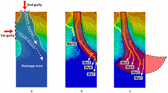 Interestingly, we combined several sets of motion trajectory curves and changed the perspective to obtain Figure 18. It can be seen from Figure 18a that there are two gullies in the whole scouring process, which are defined as the first and second gullies (i.e., tributary gullies and mainstream gullies) in order of completion. A further analysis shows that there are two modes of scouring pile integration, namely, the arc erosion accumulation mode (Figure 18b) and the fan erosion accumulation mode (Figure 18c). Arc erosion accumulation is mainly controlled by deep particles, namely, MP3, MP6, MP7, and MP10. Fan erosion accumulation is mainly affected by shallow particles, namely, MP1, MP2, MP4, and MP5. In the actual rainfall scouring process, the mainstream gullies rarely exist alone, and most of the slope erosion failure modes are characterized by the combination of multiple tributaries and the main stream, which is the effect of multiple gullies (only two gullies are considered in this model). The main stream gully mainly controls arc-shaped or linear erosion and accumulation. Due to their complex role in the slope, the interaction between laminar flow and turbulent flow is pronounced, which provides conditions for the development of tributaries and further forms the fan erosion and accumulation model. This provides favorable conditions for us to further study the internal mechanisms of coal gangue scouring and accumulation.