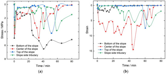 Finally, in order to elucidate the internal failure mechanism of the model, the four representative measuring balls in the model were selected, their stress–strain data were extracted, and the real-time stress–strain curves of the PFC scouring model were obtained, as shown in Figure 19. At the beginning of the scouring process, due to the initial contact between rainwater and the coal gangue particles, the overall stress on the slope surface increased, with a maximum of 4.9 MPa located at the bottom of the slope. In the later part of the first stage of scouring, the stress change in each area is not obvious, but the strain in the slope changes sharply, fluctuating between 5 and 8. When reaching the second stage (20–40 min), there are large stress fluctuation values at the bottom and middle of the slope, and the stress increases sharply at 20 min. At this time, a large number of particles in the middle of the slope accumulate towards the bottom of the slope. The large accumulation causes the stress at the bottom of the slope to increase sharply, with a fluctuation value between 2 and 6.8 MPa. It is worth noting that the stress generated by accumulation is greater than the stress caused by erosion and denudation. At this time, the stress and strain in the tributary area also begin to increase slightly, with the stress reaching 1.7 MPa and the strain reaching 5.1, indicating that the later part of the second stage is the incubation period of the tributary gully. After that, in the third stage (40–60 min), the bottom of the slope continues to accumulate, and the stress continues to fluctuate. However, due to the dense particles at the bottom of the slope, the particles are denuded less, and there is no obvious strain. At this time, the stress of the tributary increases sharply to 3.8 MPa, the tributary notch begins to form, and the strain reaches six. Then, the stress concentration is transferred from the tributary to the top of the slope, the stress of the tributary decreases to 0.4 MPa, and the stress at the top of the slope increases to 4.4 MPa. The trend of the strain curve is similar: the maximum strain at the top of the slope reaches 7.5, and then decreases sharply. At the fourth stage (60–80 min), the stress in the tributary area increases again, reaching 3.9 MPa, and the final scouring damage is completed. An alternation can be seen in the change in stress and strain at the top of the slope and in the tributary after the second stage of scouring. During the whole scouring process, the stress generated by the accumulation at the bottom of the slope is always the largest, but the damage it causes is the smallest. The strain fluctuation caused by the scouring in the middle of the slope is the largest, and the damage it causes is the strongest.