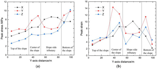 The peak values of the measurement ball data of the whole model were extracted, and the stress and strain were divided into the three directions of the XYZ data; the peak stress and strain curve is shown in Figure 20. It can be seen from the figure that the higher peak stress and strain values of the coal gangue slope scouring failure are distributed in the horizontal Y-direction of the middle of the slope, the horizontal X-direction of the tributary, and the vertical Z-direction of the slope bottom. From the peak data in the X-direction, it can be seen that the transverse peak stress increases from the top of the slope to the bottom of the slope, and the maximum value can reach 8.6 MPa in the tributary area. At this time, the peak strain also reaches the maximum value of 10.3 in the tributary region, and then decreases at the bottom of the slope (because the bottom of the slope is dense). This shows that the generation of the branch notch is mainly determined by the X-direction stress, and 8.6 MPa is the critical stress. According to the Y-direction curve, the scouring damage in the middle of the slope is the most severe, with a peak stress of 8.9 MPa and a peak strain of 14.3. The Y-direction peak stress at the top of the slope is close to that of the tributary, and both remain between 5.5 and 6.2 MPa. It can be observed that in the distance from the middle of the slope to the tributary to the bottom of the slope, the peak stress–strain curve in the Y-direction shows a “U”-type distribution feature. However, combined with the overall analysis, the stress response in the middle of the slope is stronger; this area can be described as the hub area for the development of scouring and destruction. The contact force chain of its internal particles is more likely to break and is more destructive. It can be seen from the Z-direction data that due to gravity and scouring, the energy reaching the bottom of the slope gradually increases; moreover, the peak stress gradually increases from the top of the slope to the bottom of the slope. The maximum Z-direction peak stress at the bottom of the slope can reach 10.3 MPa, but the peak strain here is only 4.6. According to the law of the stress–strain curve, the internal mechanisms of erosion failure in coal gangue slopes that were emphasized in the previous analysis are more clearly defined.