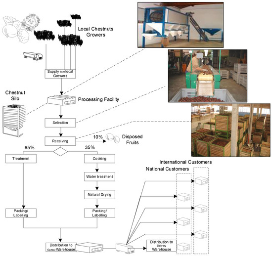 The SC operations begin with the supply of fresh fruit from the growers to the company. Then, the fruit is selected and dried. The processor pack and deliver the fruit to the sweets’ producers or serve their local distribution channels (supermarkets and shops) after shelling, drying and cooking within two parallel ovens. The ovens, propelled by wood pellets, work for 8 h a day.