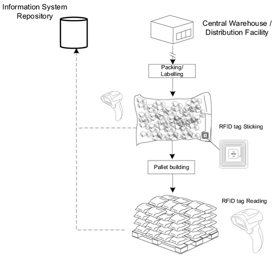 Two types of RFID systems were used in this case study: an active tag for the receiving warehouse and a passive tag for bags and pallets identification in the central and shipping warehouses. The use of the passive tags for the last two blocks was encouraged by the low investment required (less than €0.90 each) for the purchasing of the tags. These tags are often lost or damaged during de-palletizing and the de-packaging processes. RFID tags include an RFID Chip that stores small amounts of data; the RFID antenna that sends and receives radio waves, allowing the tag to communicate with an RFID reader and the substrate to protect the chip and antenna from damage.