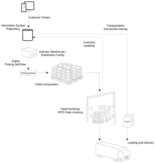 Figure 2 shows the inbound process at the receiving warehouse. The procedure is similar for outbound operations. In Figure 2, the continuous and dashed lines indicate material and information flow, respectively, while blue dashed lines indicate the new RFID information flow.