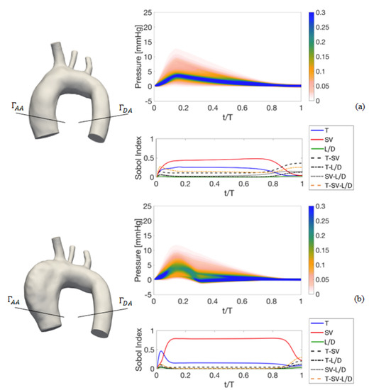 As for the PDFs and Sobol indexes for the differential pressure waveforms shown in Figure 16, the stroke volume is still the main parameter affecting result variability in the systole, with a significant effect of T as well and negligible ones for and interactions. During the diastole, again characterized by a lower variability in terms of differential pressure, is the main parameter when dealing with healthy and aneurismatic geometries, whereas the period T is the most effective for the diastolic phase in the coarctated aorta.