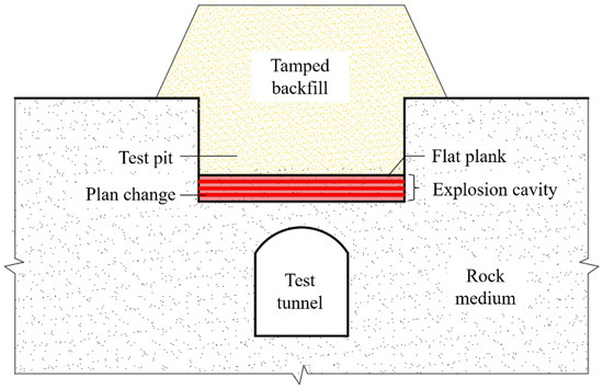 The explosion crater size of the plane charge loading test is 9.0 m × 5.5 m × 2.0 m, in which the height of the explosion cavity is 0.5 m. By adopting the high-pressure plane charge loading test technique, 384 kg of rock expanded ammonium nitrate explosive is designed to be arranged in the explosion cavity in the three layers. The head and tail of a single rock expanded ammonium nitrate explosive roll are connected to form a cord-like explosive roll with the same length as the explosion cavity. The cord-like explosive roll is evenly distributed in the explosion cavity in the three layers. All the cord-like explosive rolls are connected by the detonating fuse to form the initiation network, which is connected to the electric detonator. Each row of charge is detonated by detonating fuse to form a wire detonation. The cord-like charge of each layer is detonated at multiple points at the same time. The combination of line detonating and multi-point detonating ensures the formation of a quasi-plane blast wave after the explosion of each layer of explosives in the explosion cavity. The schematic of the high-pressure plane charge loading test is shown in Figure 1. The design value of the tamped backfill layer at the upper part of the formwork is 5 m, and the overburden density is about 1600 kg/m3.