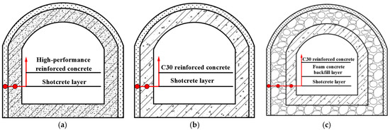 At present, there are two main ways to improve the resistance of underground engineering structures. The first is to use the high-strength materials as the main structural materials to improve the structural strength, and the second is to backfill the soft material (energy absorbing material) between the surrounding rock and the supporting structure to weaken the intensity of explosion wave, which then indirectly results in improving the resistance of the engineering structure. The high-performance concrete has some excellent properties, such as high compressive strength, toughness and durability, which are important aspects for the development of concrete material. Thus, comparing with the C30 concrete structure, the high-performance concrete structure has many advantages in the properties of anti-explosion and anti-penetration [7,8,9]. A lot of research reports indicate that the addition of steel fiber reduces the risk of explosion spalling in concrete. The presence of steel fiber can bridge microcracks inside concrete, and improve the tensile strength of concrete and the overall bearing capacity of the structure [10,11,12]. In addition, many studies have shown that under the explosion loading, the Steel Fiber Reinforced Concrete (SFRC) exhibits better explosion resistance than the ordinary concrete, and can more effectively prevent the risk of explosion spalling [13,14,15,16]. Jiao [17] carried out an explosion test for the steel-fiber-reinforced high-strength concrete, and the results showed that the SFRC had a significant anti-seismic collapse performance effect, and its anti-seismic collapse performance mainly depended on the tensile strength of the concrete. Su [18,19,20,21] conducted some extensive static and dynamic tests for the UHP-SFRC structural members added with steel fiber, and found that the steel fiber could provide bridging action and reduce the structural crack width during the structural damage. The energy dissipation characteristics of the weak interlayer in the rock have a considerable influence on the attenuation of stress waves. Because the porosity is large, it is generally compressible. Only when the medium is compacted, the stress wave can cross the layer. The larger the porosity is, the faster the attenuation of stress waves [22]. Therefore, in order to reduce the impact load acting on the inner lining structure and reduce the vibration of the structure, a certain thickness of low-density material can be backfilled between the inner lining structure and the surrounding rock to form a composite structure with more than two layers, which can improve the internal force and deformation of the inner lining structure [23,24]. To obtain the propagation law of the compression wave generated by the explosion in the inhomogeneous stratigraphic medium, Wu [25] carried out an explosion test for a large ratio circular composite structure in the medium stiff stratigraphic medium, and found that the peak pressure of the compression wave on the wavefront was unequal in intensity, and most of the energy of the compression wave was transferred to the stiffness of the medium. When the stress wave propagates to the composite structure containing the foam concrete backfill layer, the foam concrete layer can significantly reduce the peak stress [26,27,28,29,30]. Li [31,32] conducted an elastic-plastic dynamic study on the multi-layer circular structure with a foam concrete backfill layer in the rock by using the calculation program, and analyzed the dynamic test and numerical calculation results of the composite structure under the action of plane shock wave load, and discussed the dynamic characteristics of the underground multi-layer circular structure and the influence of the backfill layer thickness on the dynamic response of the structural system. The optimum thickness of foam concrete layer for the wave clipping vibration reduction, and the optimum wave impedance ratio of both the surrounding rock and the backfill material, were given. The anti-explosion and seismic performances of the high-resistance concrete structure were investigated by using the plane loading test under the condition of high pressure, and the stress, deformation and vibration characteristics of the surrounding rock, backfill layer and reinforced concrete lining were obtained. By analyzing the interaction mechanism among the three different types of structures, it was found that the composite circular structure with a soft backfill layer possessed excellent explosion and impact resistance properties.