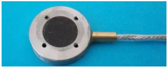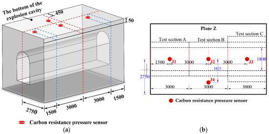 Four pressure-measuring points are designed at the bottom of the explosion cavity to measure the load at the bottom of the explosion cavity. The carbon resistance pressure sensor packaged by the flat polymer is selected as the sensor, as shown in Figure 4. The working principle of the carbon resistance pressure sensor is based on the piezoresistive effect of the composite conductive material [33]. The sensor is a flat structure, and the packaging material is the emery epoxy polymer, which has a good match of mechanical properties with the concrete and rock medium. It is considered that the fireball in the explosion cavity after the explosion probably destroy the pressure sensor and the insulated conductor, and the stress wave generated by the adjacent in-line explosive in the explosion cavity will form the Mach reflection. In order to eliminate the above adverse factors, and facilitate data collection, the strategies of setting a groove in the rock medium at the bottom of the explosion cavity, and embedding the pressure sensors and the insulated conductor as well, are adopted to shield too many interference signals. The four pressure sensors are buried in the plane Z that is parallel to the bottom surface of the explosion cavity, and 5 cm from the bottom of the explosion cavity. Since the sensor is only 5 cm away from the bottom of the explosion cavity, it can be approximately considered as the pressure at the bottom of the explosion cavity. Figure 5a is the spatial position diagram of the pressure sensors, in which the upper top surface is the bottom surface of the explosion cavity. Figure 5b is the top view of Figure 5a. Figure 5b shows the placement position of the pressure sensor on plane Z. After the pressure sensors and the wires are laid out, the interface of the sensors and the insulated conductor is lined with epoxy resin for water-proof and moisture-proof sealing treatment. The insulated conductor is laid from the side of the explosion cavity through the trench, and then fixed with plain concrete after being firmly positioned.