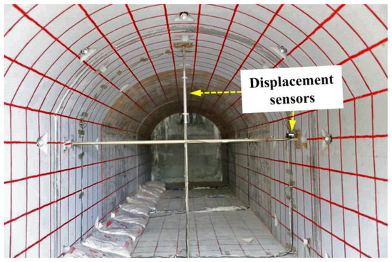 The two points between the left and right straight walls, and that between the vault and the floor center, are arranged in each test section to measure the transverse and vertical relative displacement of the structure under plane charge explosion loading. The ranges of the selected displacement sensors used in this research are 200 mm. The layouts of the displacement sensors are shown in Figure 6.