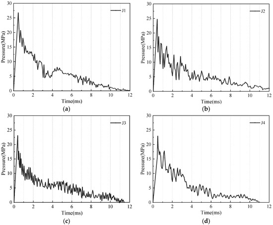 The measured pressure time travel curves at the bottom of the explosion cavity: (a) measuring point J1; (b) measuring point J2; (c) measuring point J3; (d) measuring point J4.
