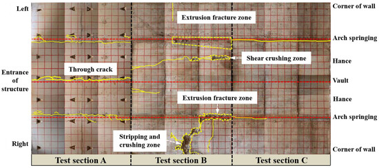 The expanded photograph of the arch and straight wall of the test sections after explosion is obtained by means of segmental shooting, cropping and combination, as shown in Figure 8. From left to right, the test sections A, B and C are shown in the figure, in which the test section A is located at the mouth of the structure. By collecting and analyzing data of the test sections suffering the explosion load, the macroscopic damage characteristics of the three different types of structures are described.