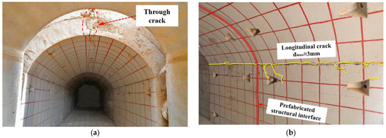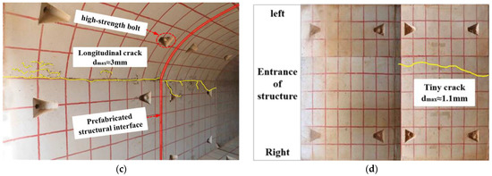 The macroscopic damage phenomenon of the internal structure of test section A after enduring the explosion load is shown in Figure 9a. The width of the crack in the middle of the vault is about 5 mm, and completely connects with the bottom of the explosion cavity. However, the crack in the vault is not a continuous straight line. The crack extends from the prefabricated bolt hole to the vault. The reason is that the high-performance reinforced concrete test section is composed of the two precast sections. Although the bolt hole has been performed in a smooth engineering treatment, the stress concentration phenomenon still occurs. In addition to the influence of the material heterogeneity and inconsistent boundary conditions at the two ends of the test section, the above asymmetrical cracks are formed.