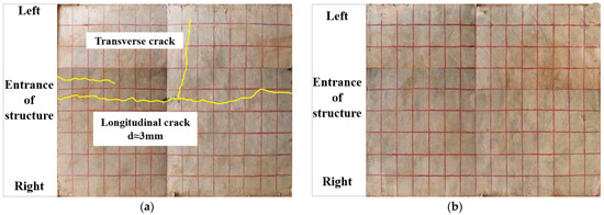 The left arch spring appears an extrusion fracture zone, part of the concrete fall off, and there is an empty drum sound when the part that does not fall off is knocked, as shown in Figure 10a. The right arch spring emerges an extrusion fracture zone within 1 m of the inner end face, with a width of 20 cm, and the concrete is crushed and dropped, as shown in Figure 10b. The left straight wall only produces a vertical micro-crack at 125 cm away from the outer end of the structure. From the perspective of the concrete falling area, the damage on the left side is relatively slight, while the straight wall on the right side is seriously damaged, resulting in a large stripping and crushing zone.