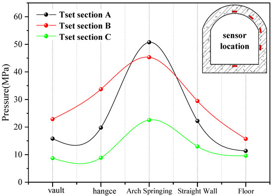The central cross-section of three test sections was selected as the structural test surface, and five pressure measuring points (vault, hance, right arch spring, straight wall center, and floor center) are set on the inner layer of each structural test surface. Each measuring point is equipped with a carbon resistance pressure sensor, wherein the pressure sensors in the arch are perpendicular to the radius direction of the arch curvature, and the interface of the sensor and the insulated conductor are lined with epoxy resin for water-proof and moisture-proof sealing treatment. The DONGHUA DH5960 dynamic signal test analyzer is used for data acquisition and recording.
