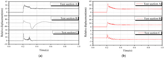 The time–history curves of the relative displacement of the structures: (a) the vertical relative displacement; (b) the transverse relative displacement.