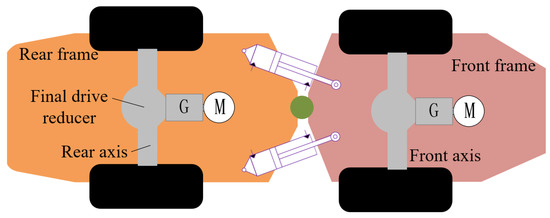 LHD vehicles, which are typical ASVs and whose structure is shown in Figure 2, are usually used to transfer heavy goods or mine materials, and, thus, it is necessary to avoid the large vertical motion of the chassis as caused by any vertical load variations. Therefore, the suspension is normally absent in the chassis of an ASV. The dynamic motion of an ASV can be revealed with planar motion, i.e., the plane parallel to the ground. According to Figure 2, the tire forces, originating from the tires, act on the front and rear frames, and the hydraulic-driven steering system drives the two frames to fold around the articulated point. Therefore, the dynamic model of ASVs can be divided into three models, i.e., the model of the frames, the model of the tire forces, and the kinematic constraints of the frames.