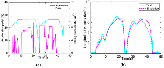 The input of the acceleration and braking pedal is shown in Figure 7a, and a comparison of the longitudinal velocity results is shown in Figure 7b. According to the results in Figure 7, the test vehicle accelerated with small and intensive maneuvers between approximately 3 and 8 s, and fast acceleration occurred at 10~20 s and 25~39 s. The pressure of the braking system remained constant, around 10.3 MPa, when there was no braking motion, and it decreased rapidly to 4.1 MPa when the brake was triggered around 21~24 s. According to the results in Figure 7b, the longitudinal velocity in the field test and the simulation varied for the same trend and amplitude. The two results almost coincided during the acceleration and braking maneuvers, and only minor differences appeared during the free-running period, i.e., 39~41.8 s, while the same difference also occurred around 9.2~10.1 s. This error was brought on by the rolling resistance force model. The used resistance force model was established based on the paved road condition, while the test road was an unpaved road. The maximum velocity of the test was about 7.1 km/h, and the corresponding result was about 6.9 km/h. Therefore, the model can reveal the longitudinal dynamics of an ASV.