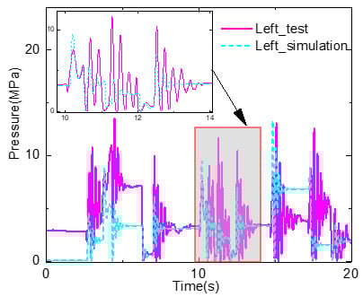 According to the structure of the hydraulic pipes in Figure 3, the rodless chamber of the left cylinder is connected to the rod chamber of the right cylinder and vice versa for the other chambers. Therefore, only the pressures of the two chambers obviously varied. Additionally, we compared the results of the two chambers and found that the trends and amplitudes were almost same. Therefore, only the rodless chamber pressure of the left steering cylinder, shown in Figure 10, was analyzed. As it can be seen, the steering pressure varied between 0.1 and 14 MPa. During the steady steering process, the valve was closed, the pressure oil was cut off, and all chambers of the cylinders were closed. The pressure might remain constant at a different level, which is reasonable and independent of the dynamic model accuracy at this stage. During the steering process, between 10 and 13 s, the simulation results coincided well with the test results, causing the small trend according to the detailed figure. The results of the analysis indicate that the established simulation platform can simulate the dynamic responses of the steering system well.