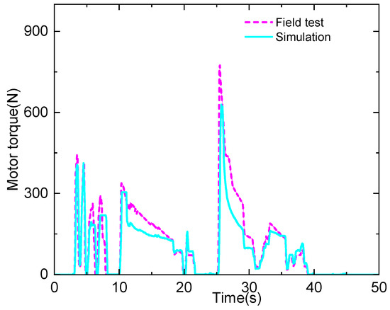 In order to validate the power train model, we recorded the torque information of the front and rear motors during the test, and the torque of the two motors was the same; thus, only the front motor is shown and compared with the simulation results in Figure 11. As it can be seen, the maximum torque was about 780 Nm during the presented test interval, and the maximum torque was about 650 Nm in the simulation, meaning that they occurred at the same time. Additionally, a large difference occurred during the slow reduction stage, i.e., at 11~17 s and 26~29.5 s. In the simulation model, the motor was considered to be a table with two parameters, the acceleration pedal and speed. The resulting torque might be slightly different from the actual characteristic of the motor. During the other stages, the simulation and test results coincided well, especially during the low-torque stages.