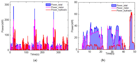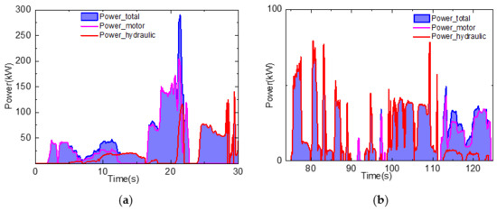 Detailed information of the load and dump processes is shown in Figure 13a,b. For the results in Figure 13a, after the insertion of the bucket tip, the hydraulic power raised sharply due to the retraction of the bucket [26]. The motion needed to cover the stacking resistance force of the material pile. After that, i.e., the time after 23 s, the hydraulic power raised again, but it was less than 150 kW. During this process, the bucket and boom cylinders were cooperatively driven to load the material. In the dump process, the bucket needed to firstly be lifted and tilted. Then, the bucket returned to the original place with the cooperative control between the bucket and boom cylinders. Therefore, multiple fluctuations in the hydraulic power were involved. The maximum power of the dump process was less than 82 kW according to Figure 13b. After the dump process, the LHD vehicle was driven back to the load point, and the motor power and hydraulic power, i.e., the steering system, dominated in this region.