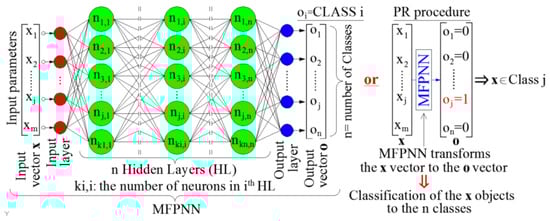The first step towards the development of a methodology for the damage assessment of RC buildings using PR and MFPNN is the definition of the relevant input and output parameters, considering the basic principles of the PR problems and the solution procedure using MFPNN. By definition, PR is the procedure for detecting and classifying objects of the same type into specific classes. A PR problem can be defined using three different approaches: the supervised learning approach, the unsupervised learning approach, or the reinforcement learning approach []. The software application developed herein applies the supervised learning approach. Therefore, the target of the applied algorithm is the consistent classification of objects into pre-defined classes. For this reason, the creation of an appropriate dataset and the training of a properly configured MFPNN using this dataset are required. The general configuration of an MFPNN, which can be used to solve a PR problem with n pre-defined classes implementing the supervised learning approach, is depicted in Figure 1. The population of the input parameters, i.e., the parameters that describe the objects (elements of the input vectors x) is m. Thus, in this case, the target is the classification of objects described using the x vectors (having m parameters) into n predefined classes.