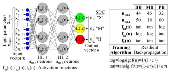 The first step of RVI methods, either in the pre- or post-seismic phase, is the classification of structures into classes accounting for their seismic damage extent. This approach is compatible with the scope of the PR problems, which are dedicated to the classification of objects of the same type into pre-defined classes. The basic idea for the framework and software developed is to relate the macroscopic structural parameters (collected in the framework of RVI) and the seismic input parameters (based on selected accelerograms) to the expected seismic damage extent that is qualitatively and quantitively defined through seismic damage classes (SDC). Therefore, a preliminary rating of a structure is possible, which can be a valuable tool for rapid assessment and retrofit prioritization for both pre- and post-earthquake assessment. Regarding the computational framework, the multilayered feedforward perceptron neural networks (MFPNN) were selected to solve the PR problem. Several research studies have highlighted the effectiveness of this type of artificial neural network (ANN) within the last three decades [,,,,,,]. In addition, it should be noted that the use of ANNs as a computational tool in software development for the estimation of seismic damage assessment of structures has been proposed in recent years [,].