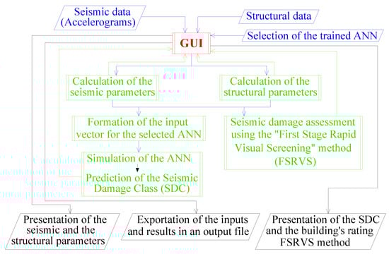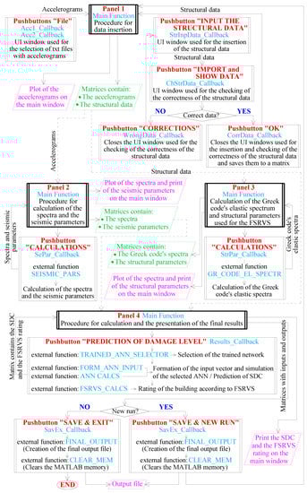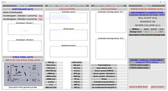 Τhe developed software provides (a) prediction of the expected DS (SDC) of RC buildings subjected to seismic ground excitations (considering two horizontal components of the corresponding seismic records) using properly trained ANNs that can be alternatively added by the user and (b) estimation the buildings’ seismic damage rating using the first stage rapid visual screening (FSRVS) procedure, which is practically an RVI methodology proposed by Earthquake Planning and Protection Organization of Greece (E.P.P.O.) for pre-earthquake assessment []. Furthermore, the software provides (as intermediate results) the parameters that describe the selected seismic excitation (spectra and seismic parameters) and properly selected structural parameters that are critical for the seismic damage assessment of a studied RC building.