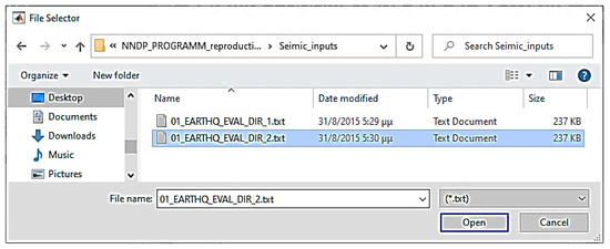 The two push buttons entitled “FILE” activate a window with a file selector for the selection of the accelerograms of the earthquake excitation (in text file format) in directions 1 and 2 (Figure 6).