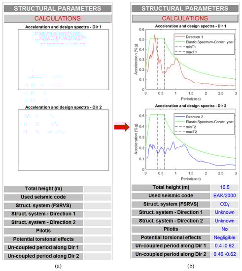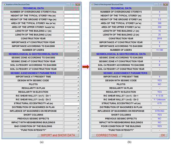 The push button entitled “INPUT OF THE STRUCTURAL DATA” activates a window that contains the appropriate GUI control tools/components (i.e., “static text”, “edit text”, and “popup menu”) for the insertion of the required structural data (Figure 7a). It should be outlined that the inserted structural data are used for the formation of the input vector for the trained ANNs and the DS prediction as well as for the seismic damage assessment and prioritization of the RC building studied, in line with the FSRVS rating system proposed by E.P.P.O. [].